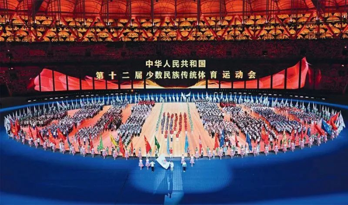 2024年11月22日,中華人民共和國第十二屆少數(shù)民族傳統(tǒng)體育運(yùn)動(dòng)會(huì)開幕式在海南省三亞市舉行,56個(gè)民族歡聚一堂,共同奏響中華民族一家親、同心共筑中國夢的華美樂章。圖為開幕式現(xiàn)場。 新華社記者 郭程/攝
