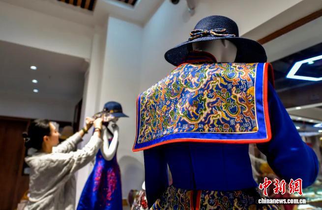 2024年1月11日,新疆烏魯木齊市二道橋大巴扎非遺文創(chuàng)館,工作人員在整理融入“五星出東方利中國(guó)”織錦護(hù)膊圖案的服飾。中新社記者
