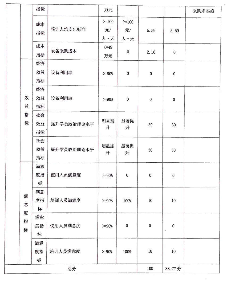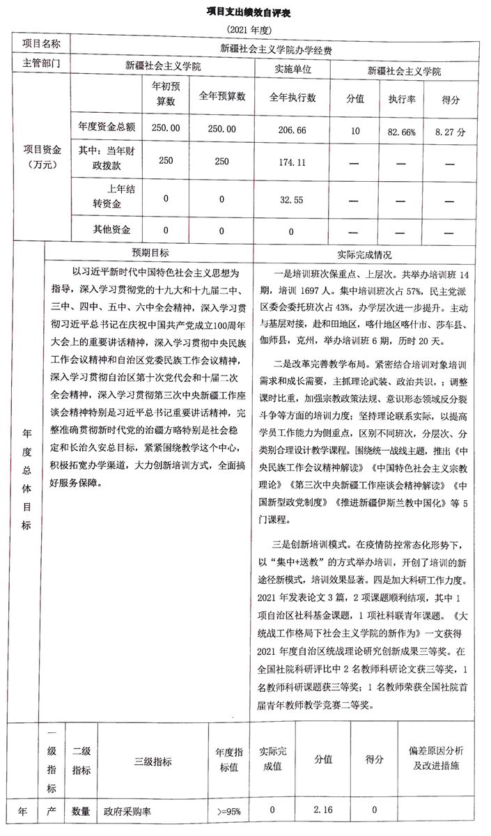 根據(jù)預(yù)算績效管理要求,我單位 2021 年度開展預(yù)算績 效評價(jià)項(xiàng)目 1 個(gè),共涉及資金 206.66 萬元。預(yù)算績效管理 取得的成效:一是培訓(xùn)班次保重點(diǎn)、上層次。共舉辦培訓(xùn)班 14 期,培訓(xùn) 1697 人。集中培訓(xùn)班次占 57%, 民主黨派區(qū)委 會(huì)委托班次占 43%,辦學(xué)層次進(jìn)一步提升。主動(dòng)與基層對接, 赴和田地區(qū),喀什地區(qū)喀什市、莎車縣、伽師縣,克州,舉 辦培訓(xùn)班 6 期,歷時(shí) 20 天;二是改革完善教學(xué)布局。 緊密 結(jié)合培訓(xùn)對象培訓(xùn)需求和成長需要,主抓理論武裝、政治共 識;調(diào)整課時(shí)比重,加強(qiáng)宗教政策法規(guī)、意識形態(tài)領(lǐng)域反分 裂斗爭等方面的培訓(xùn)力度;堅(jiān)持理論聯(lián)系實(shí)際,以提高學(xué)員 工作能力為側(cè)重點(diǎn), 區(qū)別不同班次,分層次、分類別合理設(shè) 計(jì)教學(xué)課程。 圍繞統(tǒng)一戰(zhàn)線主題,推出《中央民族工作會(huì)議 精神解讀》《中國特色社會(huì)主義宗教理論》《第三次中央新 疆工作座談會(huì)精神解讀》《中國新型政黨制度》《推進(jìn)新疆 伊斯蘭教中國化》等 5 門課程;三是創(chuàng)新培訓(xùn)模式。在疫情 防控常態(tài)化形勢下, 以 “集中+送教” 的方式舉辦培訓(xùn),開 創(chuàng)了培訓(xùn)的新途徑新模式,培訓(xùn)效果顯著。 四是加大科研工 作力度。2021 年發(fā)表論文 3 篇,2 項(xiàng)課題順利結(jié)項(xiàng),其中 1 項(xiàng)自治區(qū)社科基金課題,1 項(xiàng)社科聯(lián)青年課題?!洞蠼y(tǒng)戰(zhàn)工作格局下社會(huì)主義學(xué)院的新作為》一文獲得 2021 年度自治區(qū)統(tǒng)戰(zhàn)理論研究創(chuàng)新成果三等獎(jiǎng)。在全國社院科研評比中 2 名教師科研論文獲三等獎(jiǎng),1 名教師科研課題獲三等獎(jiǎng);1 名教師榮獲全國社院首屆青年教師教學(xué)競賽二等獎(jiǎng)。發(fā)現(xiàn)的 問題及原因:一是資金支出率較預(yù)期目標(biāo) 250 萬元有偏差, 項(xiàng)目資金產(chǎn)生結(jié)轉(zhuǎn)結(jié)余。原因:在疫情防控常態(tài)化形勢下, 學(xué)院以 “集中+送教” 的方式舉辦培訓(xùn)班,導(dǎo)致培訓(xùn)費(fèi)支出 較預(yù)算有偏差。下一步改進(jìn)措施:一是年初預(yù)算的資金安排 和使用上有不可預(yù)見性,需加強(qiáng)綜合考慮各方面因素,合理 設(shè)置預(yù)算績效指標(biāo);二是加快項(xiàng)目資金預(yù)算執(zhí)行進(jìn)度,減少 項(xiàng)目資金結(jié)轉(zhuǎn)結(jié)余。具體項(xiàng)目自評情況附項(xiàng)目支出績效自評表。